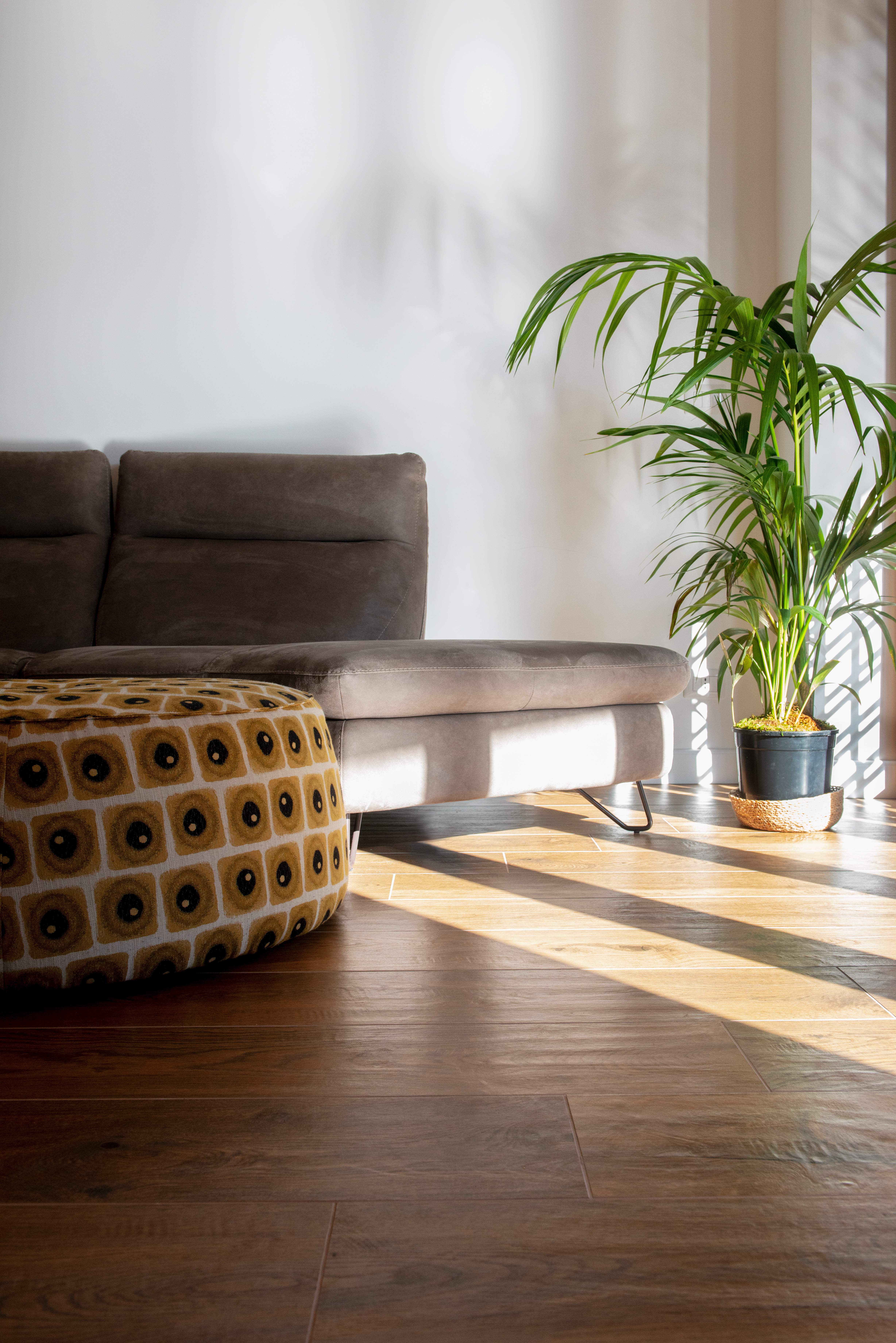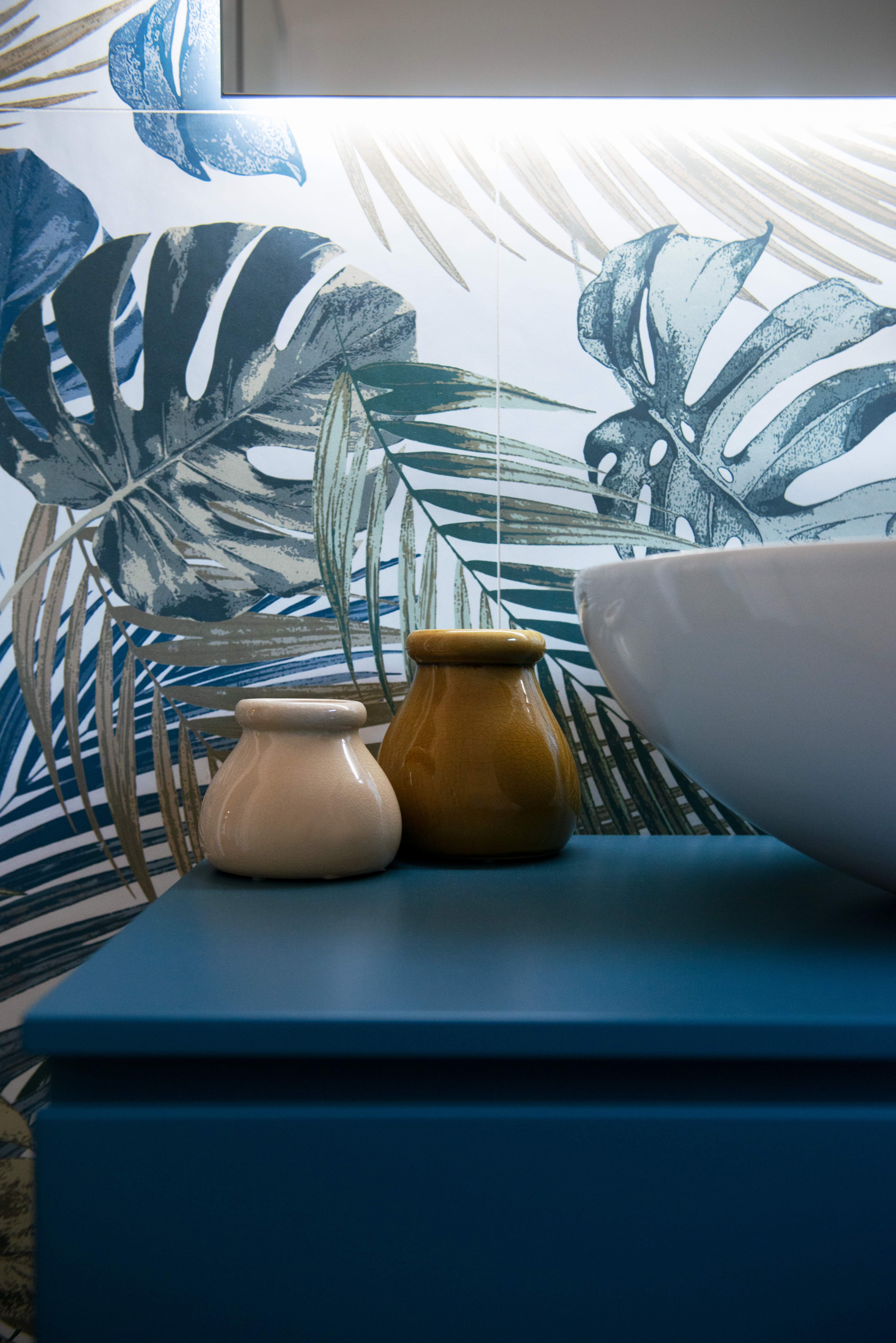 Nel bagno, la carta da parati tropicale e il mobile blu creano un’atmosfera fresca e rilassata, mantenendo coerenza con lo stile naturale e contemporaneo che caratterizza l’intera abitazione