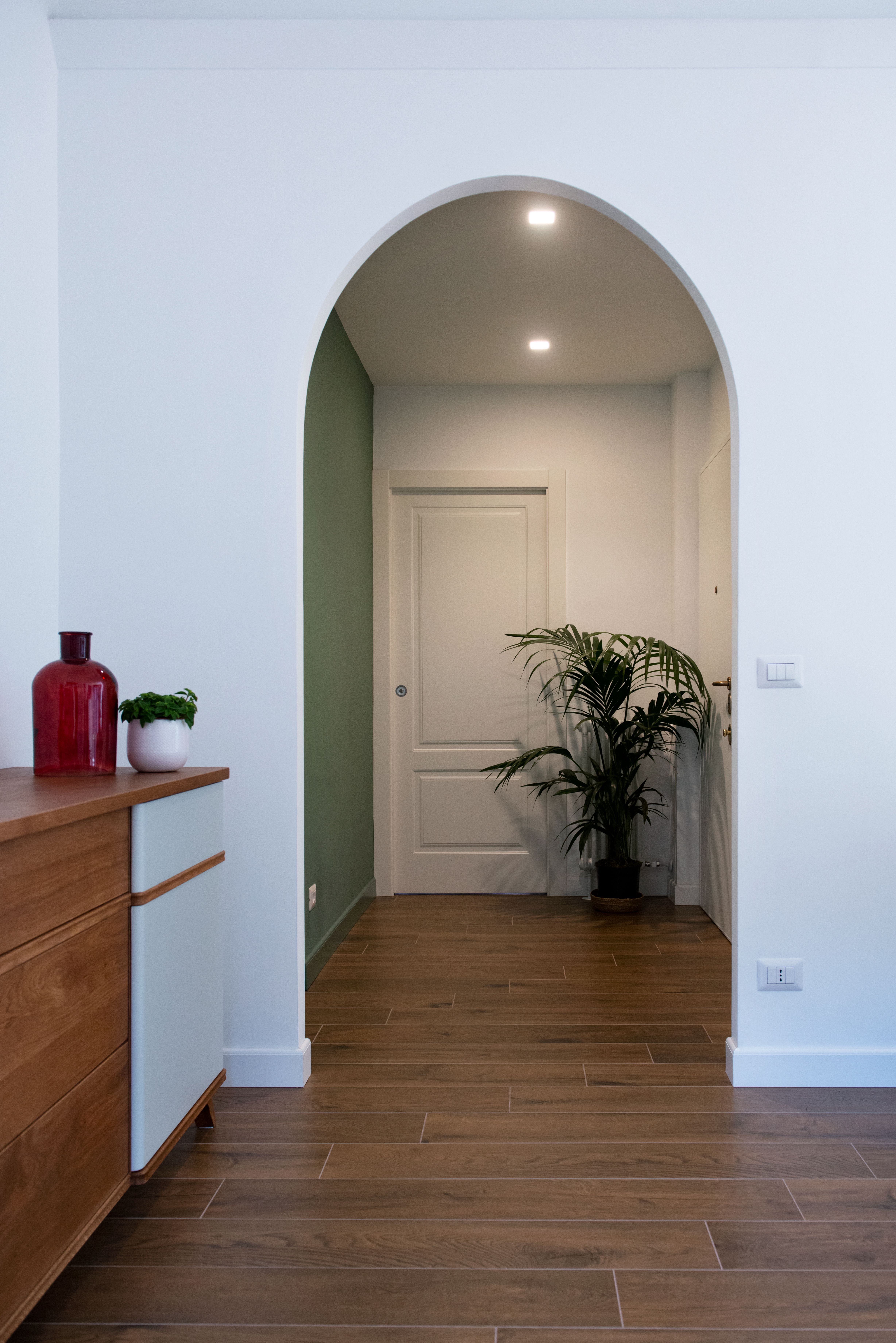 L’intervento punta a creare ambienti caldi e accoglienti, giocando sull’equilibrio tra funzionalità e atmosfera. Il pavimento in legno e le essenze naturali degli arredi si abbinano a toni opachi di verde salvia e azzurro polvere, che conferiscono carattere senza appesantire gli spazi.