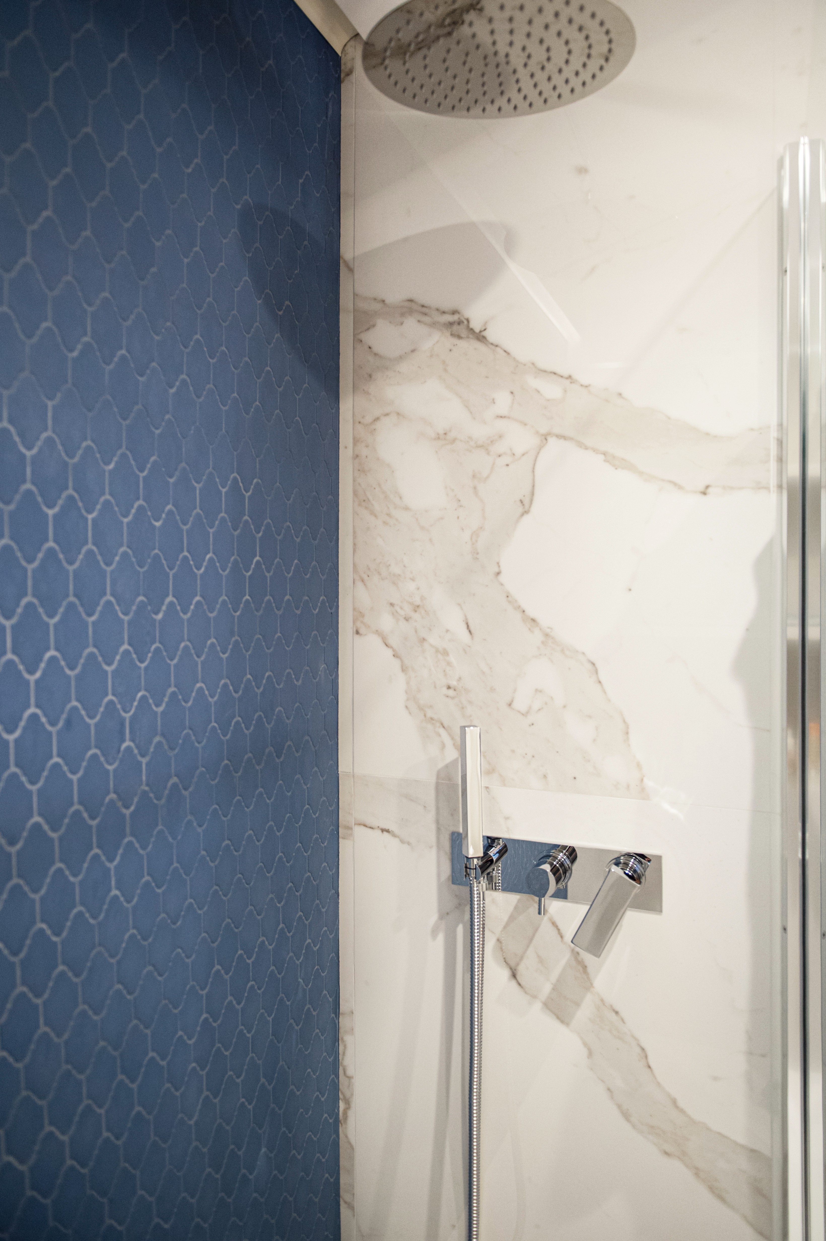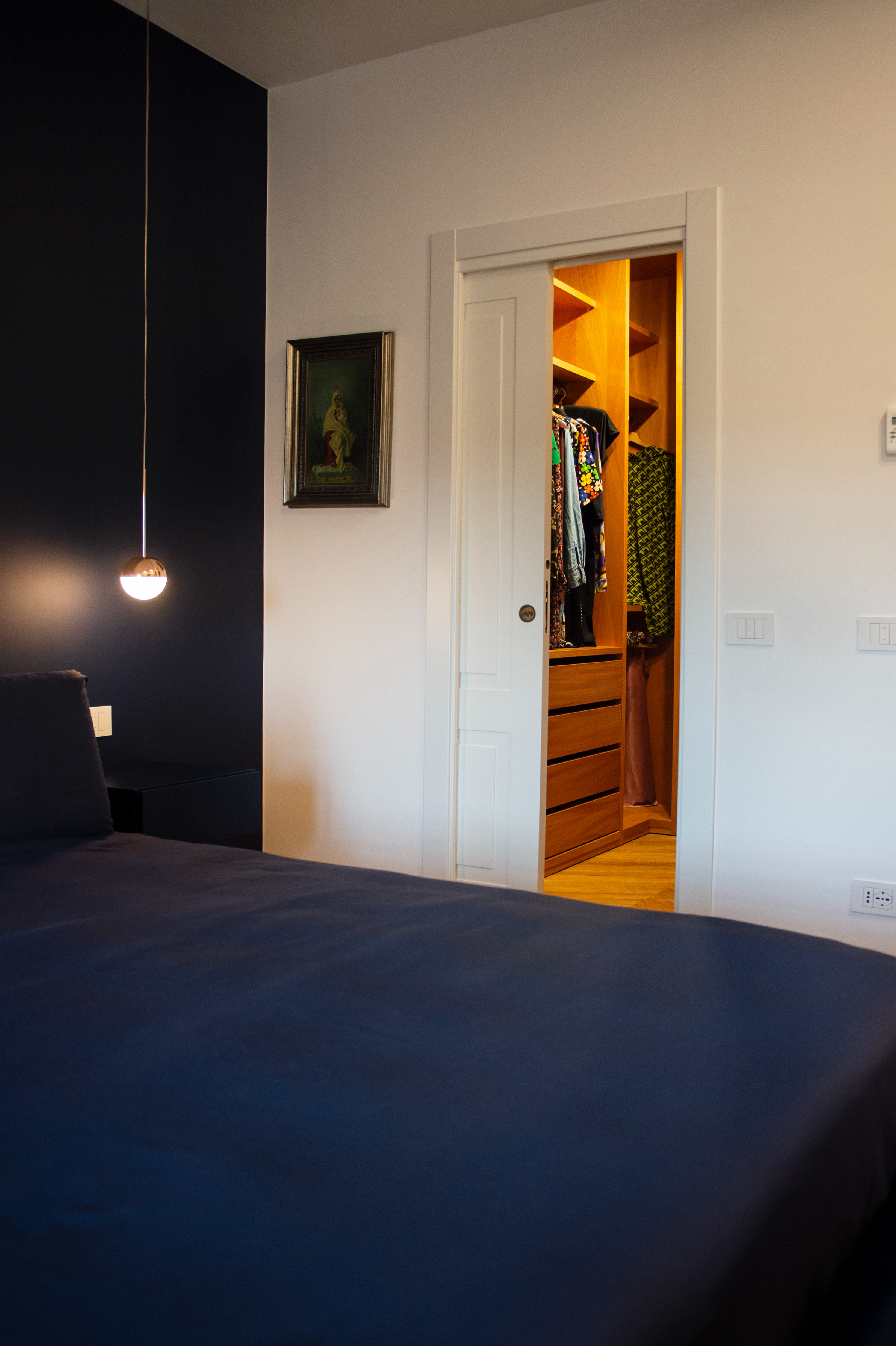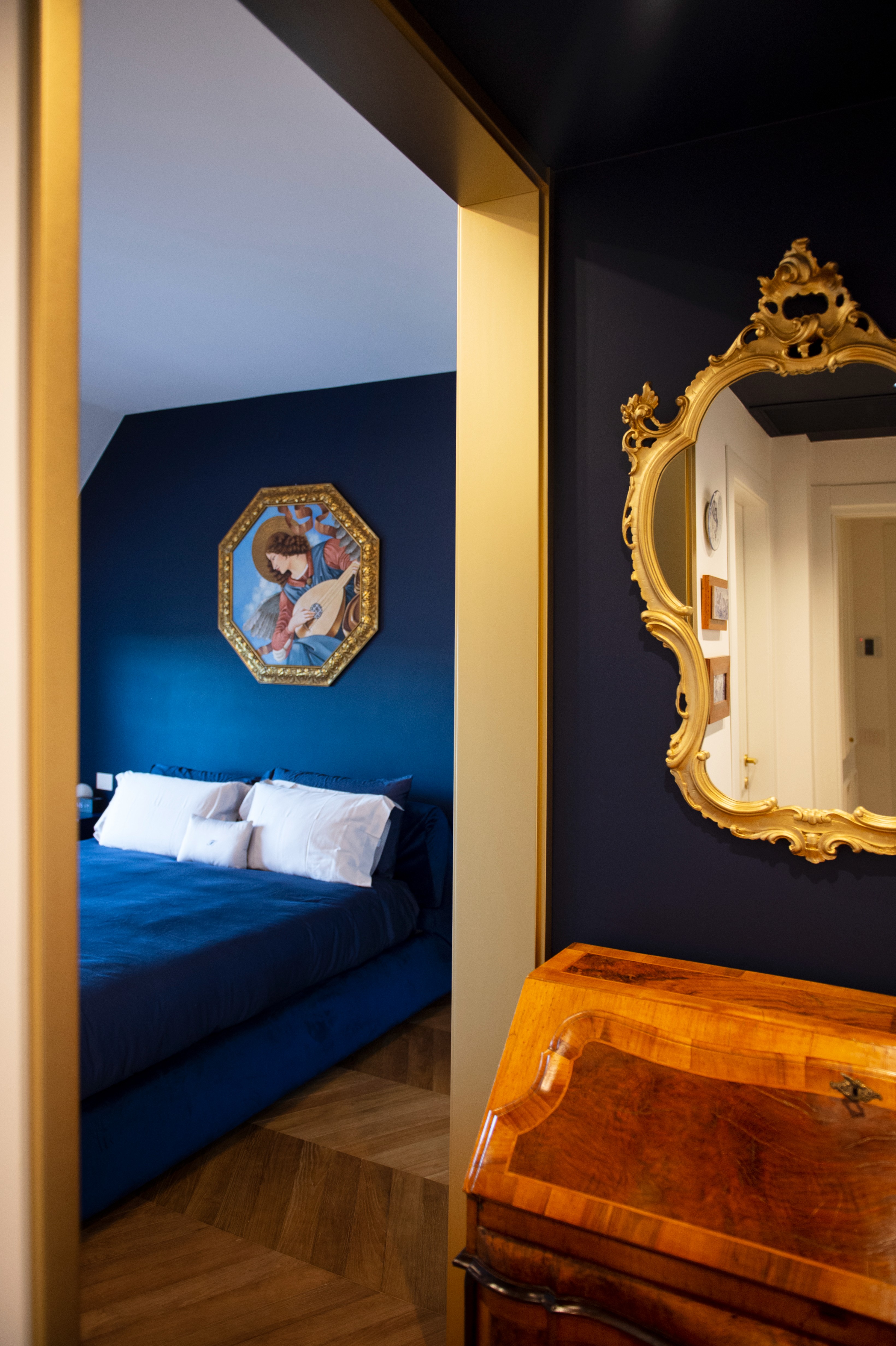 Lo stile scelto è un raffinato francese contemporaneo, impreziosito da un parquet ungherese che dona ritmo e calore a tutti gli ambienti. Le tonalità del blu, protagoniste nella cucina, nella camera padronale e nel bagno ospiti, si alternano a toni neutri e cipriati creando un equilibrio sofisticato e senza tempo.