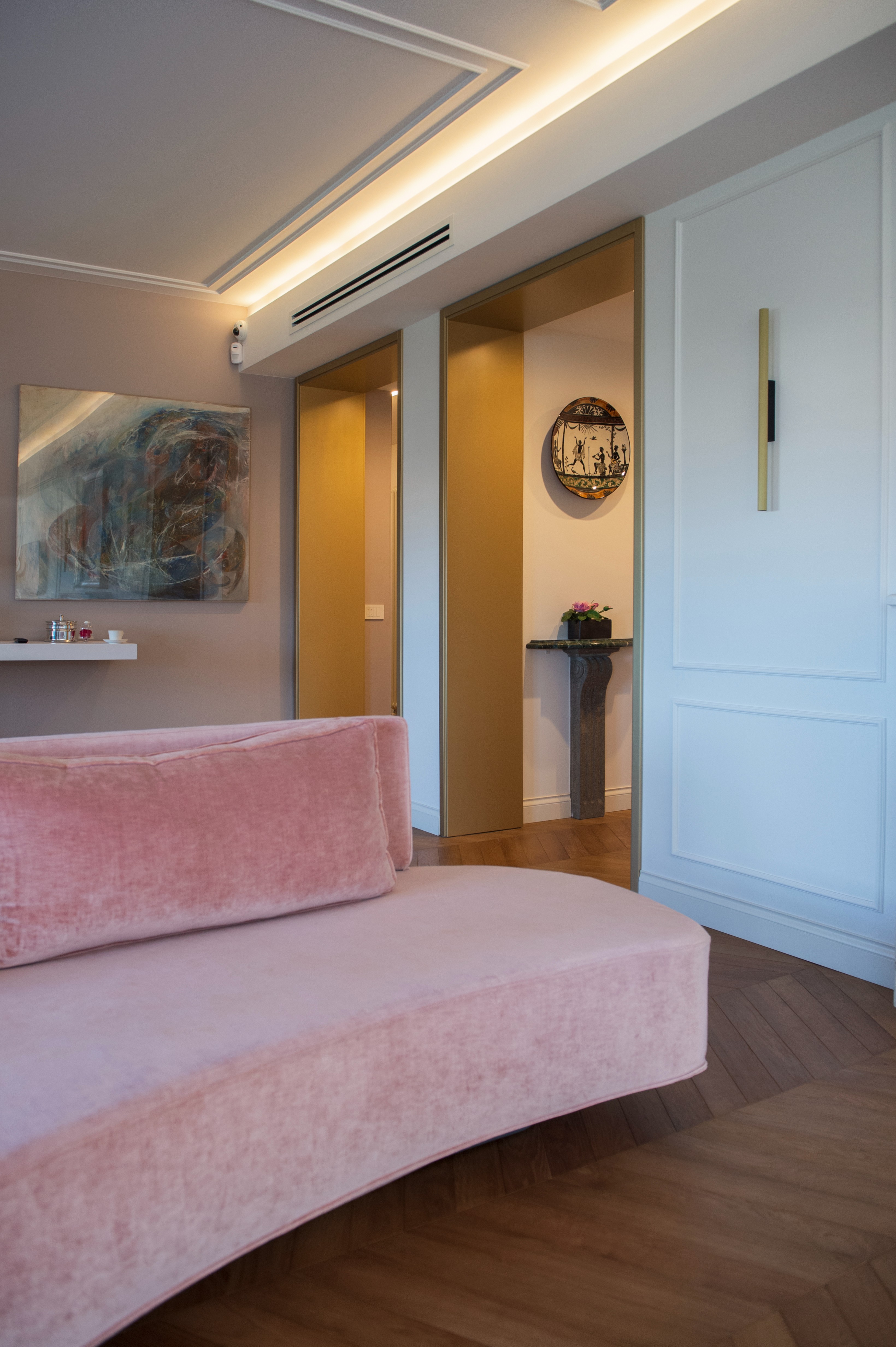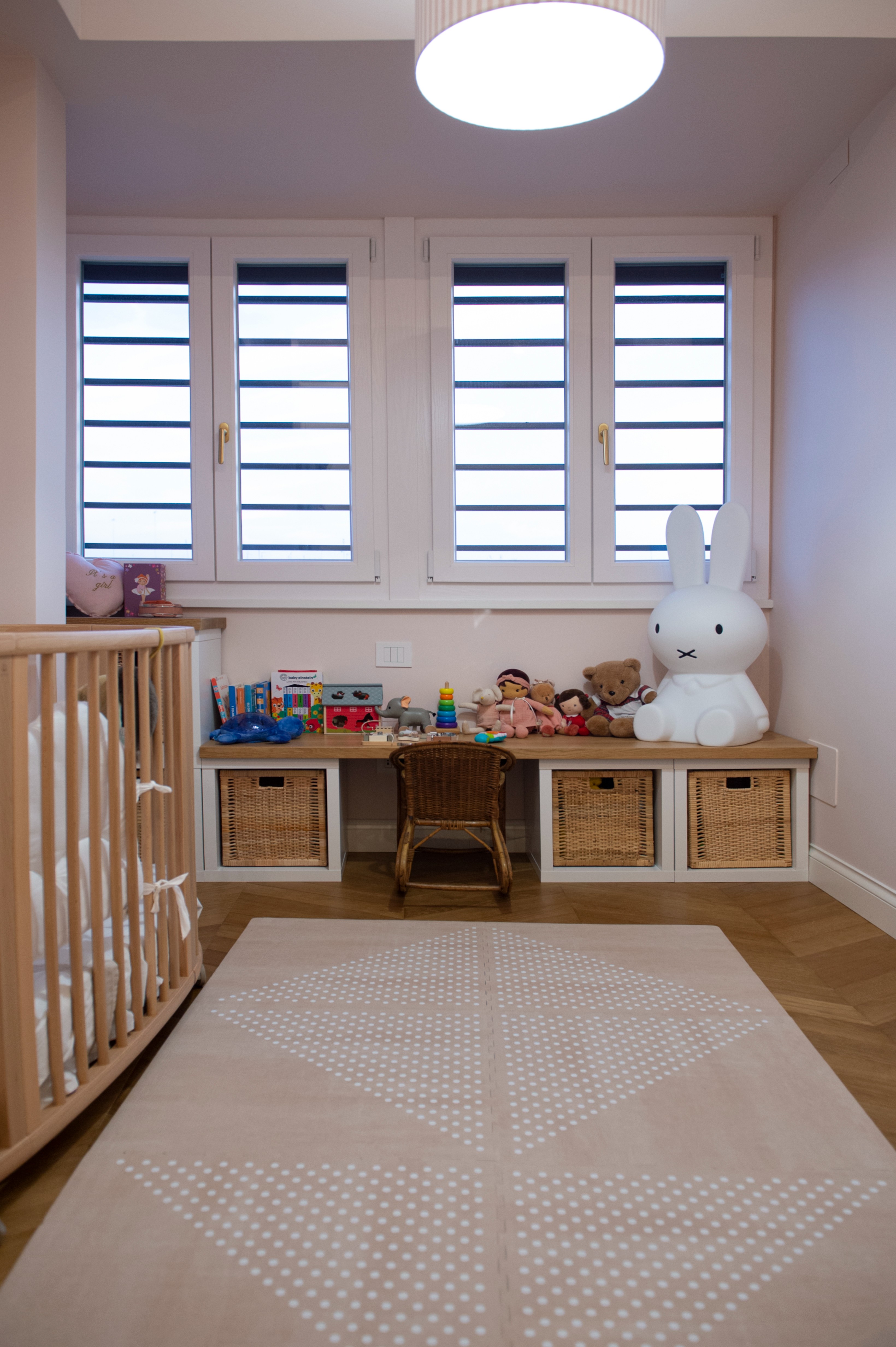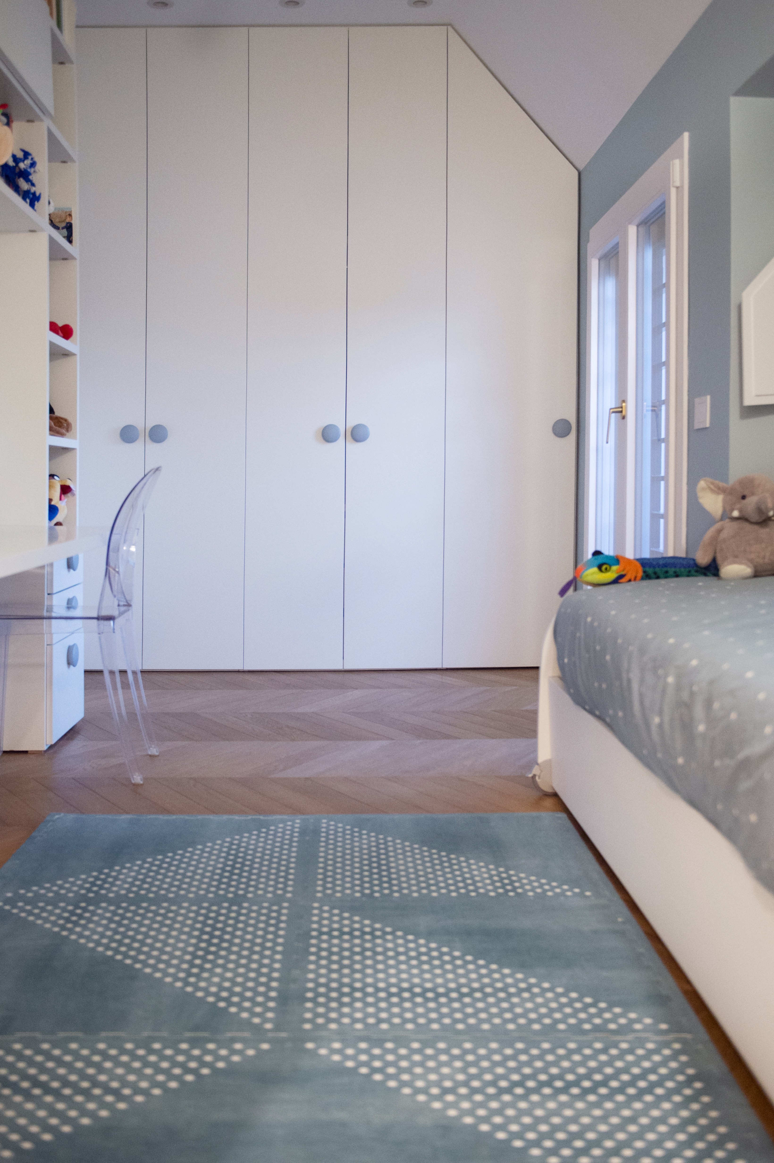 Arredi artigianali, mobili su misura e boiserie integrate celano passaggi e porte, disegnando un racconto continuo da un ambiente all’altro. Ogni dettaglio — dalle luci agli imbotti, dai materiali ai tessuti — è stato pensato per riflettere le esigenze di vita quotidiana della famiglia e allo stesso tempo evocare un’atmosfera vagamente parigina, fatta di charme, equilibrio e discreta eleganza.